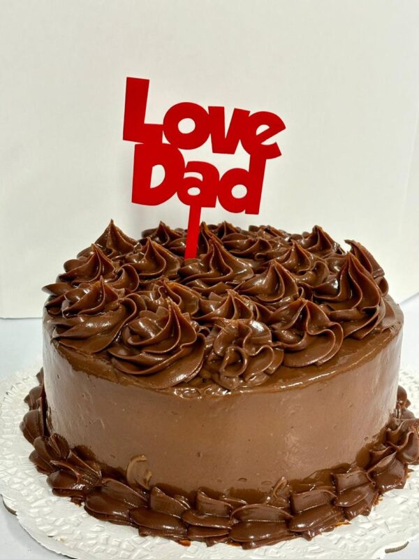 Torta de chocolate rellena con fudge con decoración de cartel “Love dad”.