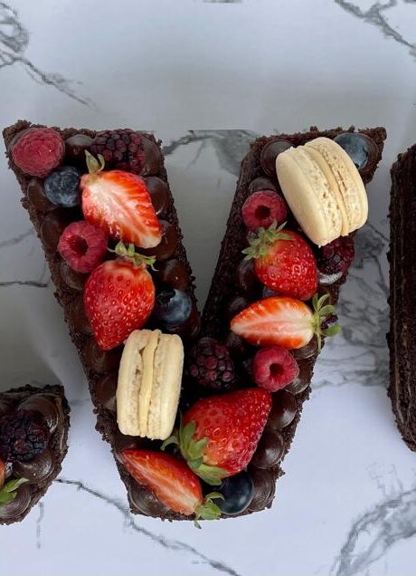 Torta de chocolate rellena con dos capas de manjar decorada con frutos del bosque y macarrones.